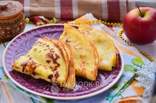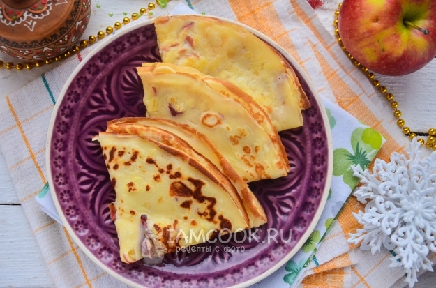 Подавайте вкуснейшие блинчики сразу же. Перед подачей блины с яблочным припеком можно присыпать сахарной пудрой или тертым шоколадом, полить сладким соусом, сгущенкой или медом.