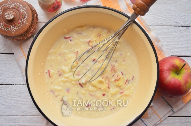 Свежее мытое яблоко натрите на крупной терке, оставив лишь сердцевинку. Переложите яблоко в миску с тестом и продолжите все перемешивать.