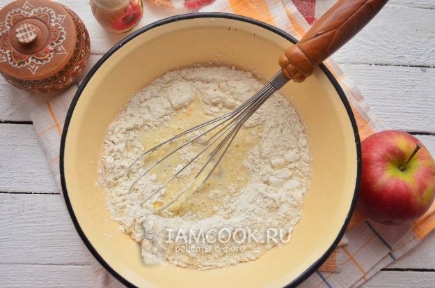 Начните все интенсивно перемешивать венчиком. Попутно подсыпайте предварительно просеянную пшеничную муку, не прекращая размешивать.