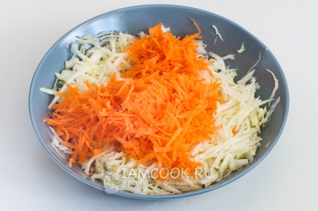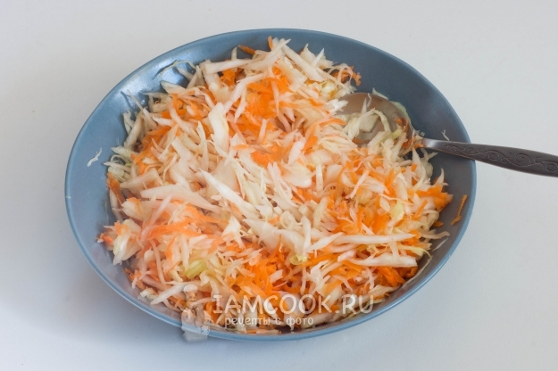 Белокочанную капусту тонко нашинкуйте и руками помните вместе с солью, чтобы капуста размягчилась.
