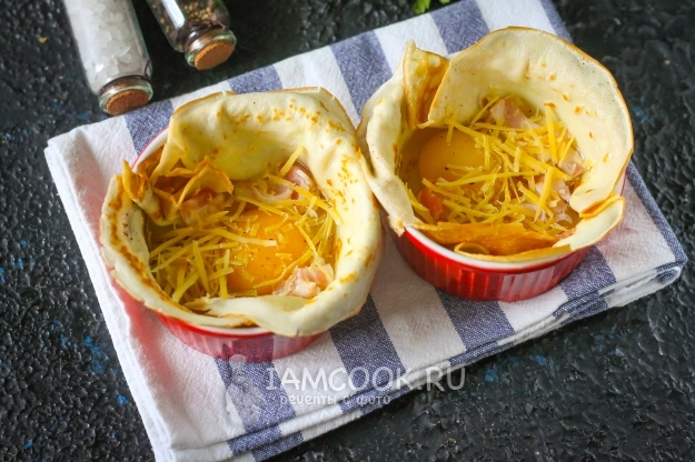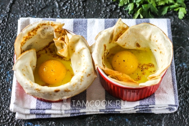 Вбейте внутрь каждой корзинки из блинов куриное яйцо, посолите и поперчите.
