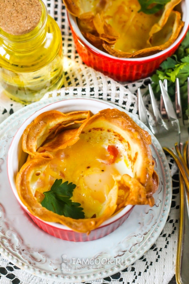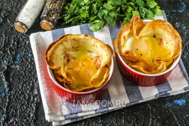Чтобы края блинов не подгорели и начинка успела приготовиться, запекайте блюдо не в середине духовки, а чуть ниже, передвинув решетку или противень. Яйца для начинки выбирайте из куриных или перепелиных. Так как блюдо получается несладким, то лучше всего не добавлять сахар в блинное тесто, чтобы получить соленые блины. Не забывайте смазывать формы для запекания маслом, по желанию можно воспользоваться одной широкой формой и приготовить в ней большее количество завтраков, особенно если семья большая. При подаче обязательно украсьте корзинки из блинов свежей зеленью!