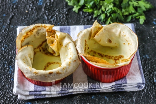 Смажьте формочки растительным маслом, выложите в них блины, создавая корзинки. Разогрейте духовку до 180°С.