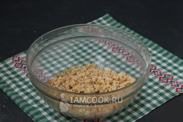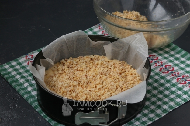 Для начинки смешать муку с сахаром и холодным маслом, перетереть в крошку, добавить измельчённые грецкие орехи.