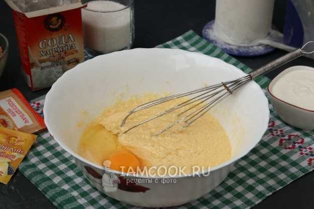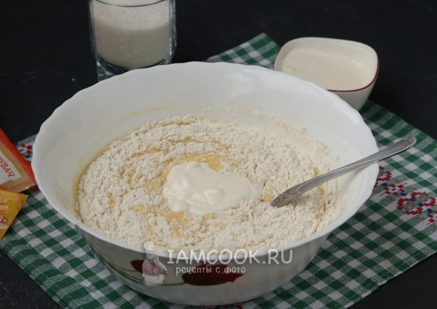 В яично-сахарную смесь в 3-4 приёма добавить мучную массу и сметану, тщательно перемешивая. Тесто получится как сметана средней густоты.