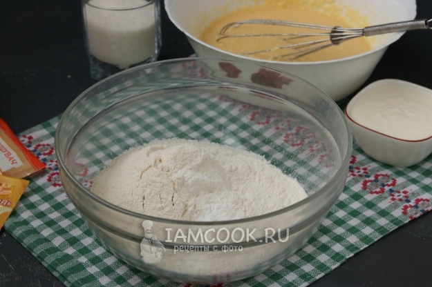 В отдельной миске смешать муку с содой и разрыхлителем.