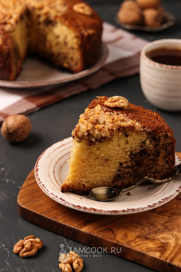 При выпечке слои перемешаются и получится абстрактный рисунок, а сверху будет аппетитная хрустящая корочка. Когда пирог остынет, можно его разрезать и подавать к чаю или кофе.