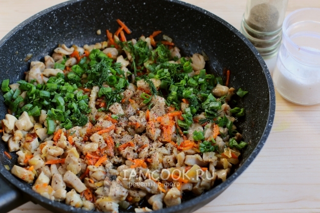 Куриное мясо обжаривается очень быстро, буквально за 3 минуты. Сразу снимем с плиты, добавим соль, перец и измельченную зелень.