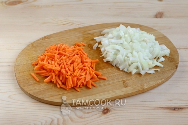 Так как тесто делается очень быстро и сразу будет готово к выпечке, сделаем в первую очередь начинку из куриного филе. Для начинки очистим луковицу и морковь, после нарежем их.