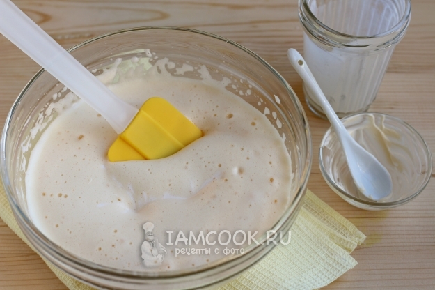 Просеиваем в миску муку и размешиваем лопаткой. Если вам покажется, что тесто чересчур жидковатое, добавьте еще совсем немного муки, ведь в зависимости от качества муки ее количество в каждом рецепте может немного отличаться.