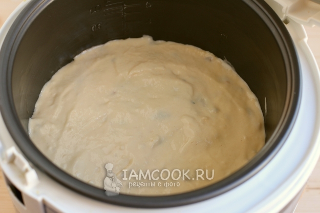Чашу мультиварки смазываем сливочным маслом и выливаем половину теста. Я на дно положила круг из пергамента, хотя этого можно было и не делать, так как чаша - с хорошим антипригарным покрытием.