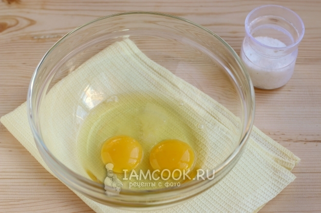 Начинку мы подготовили, теперь займемся тестом. Разбиваем яйца в миску, всыпаем соль, после начнем взбивать миксером.