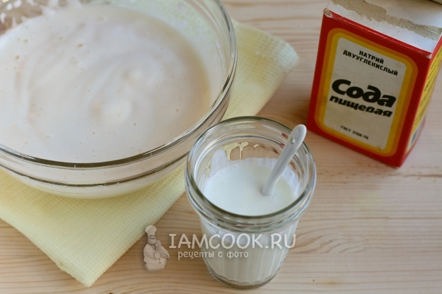 В кефир добавим соду, размешаем.