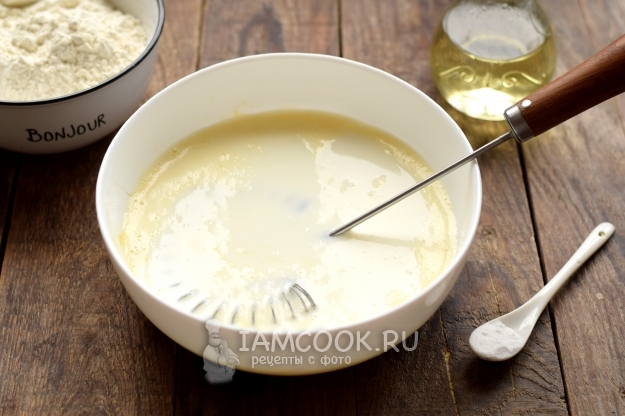Далее влейте теплую ряженку, продолжайте перемешивать состав венчиком.
