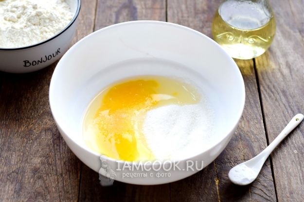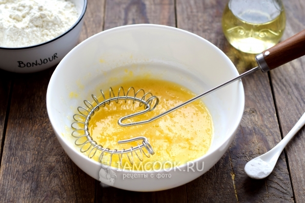 Яйцо расколотите вместе с сахаром, используя ручной венчик. Взбивайте на протяжении нескольких минут, чтобы сладкие кристаллики максимально растворились в пышной яичной смеси.