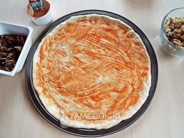 Лист для пиццы или противень смазать маслом. Раскатать тесто по форме.