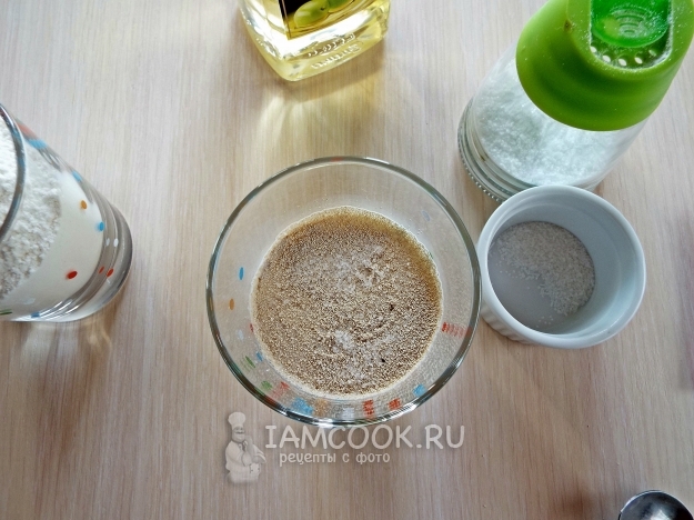 Высыпать дрожжи и сахар. Перемешать и дать немного постоять.