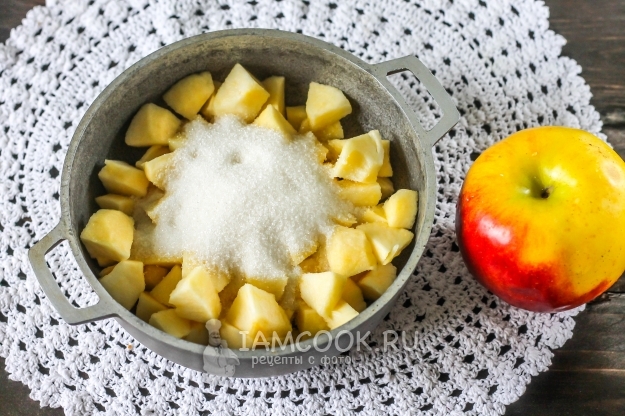 Яблоки очистите от кожуры и удалите семена, промойте в воде и нарежьте мякоть средними кубиками. Высыпьте в казан, ковш или сковороду с высокими бортиками, всыпьте сахар и влейте лимонный сок. Аккуратно перемешайте и поместите на плиту, томя около 15 минут. Время от времени перемешивайте.