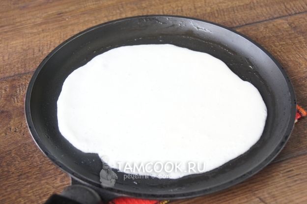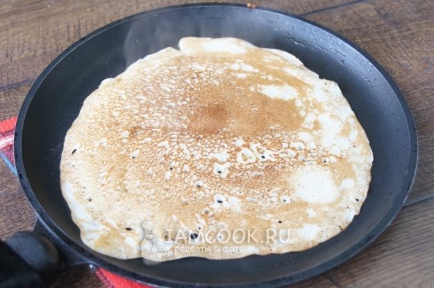 Сковороду накалила, смазала маслом, налила тесто и распределила по сковороде ровным слоем, обжарила до румяности.