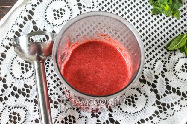 Измельчите вишневую мякоть вместе с соком, превращая их в однородную массу. Туда же влейте воду с распущенным в ней желатином. Снова отпюрируйте.