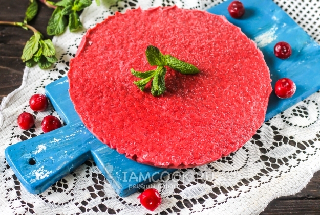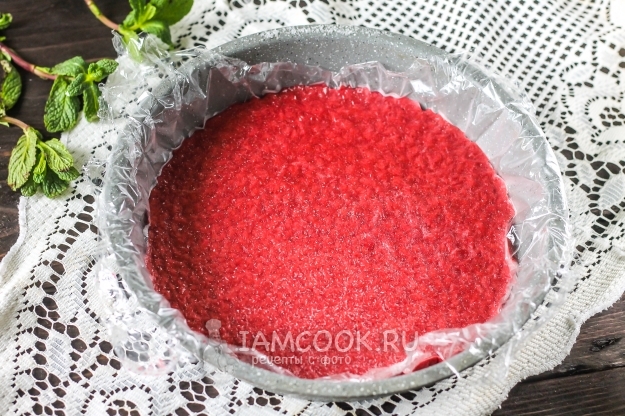 Застелите пищевой пленкой выбранную форму и влейте в нее вишневую массу. Поместите в морозильную камеру на 1 час.
