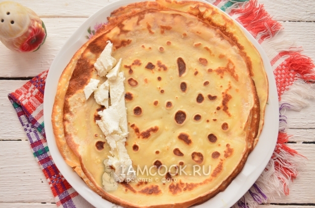 Готовые блинчики сложите на блюдо. На край каждого блина выложите сыр Фета, разломанный на длинные тонкие кусочки.