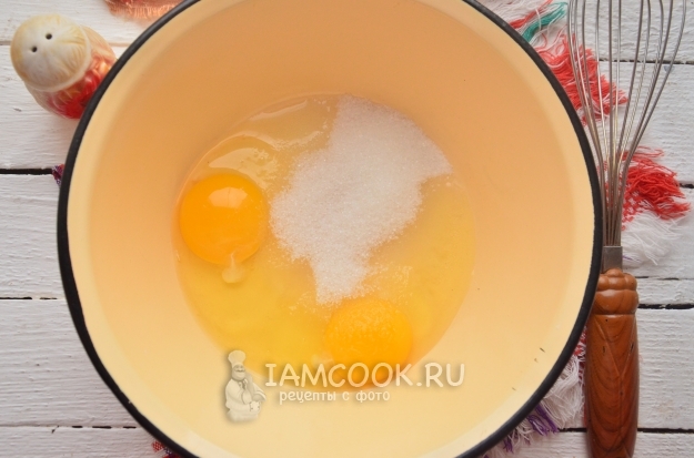 В глубокую миску вбейте пару свежих куриных яиц, туда же добавьте сахар-песок. По желанию можно добавить и больше сахара - я, к примеру, не люблю очень сладкие блинчики.