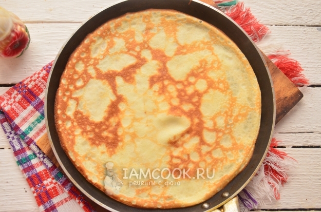 Поставьте сковороду на огонь и налейте столовую ложку масла, распределите по всей поверхности. Вылейте через минуту небольшое количество блинного теста и распределите по сковороде. Жарьте на слабом огне в течение 1,5-2 минут. Затем переверните блинчик на другую сторону и жарьте еще минуту.