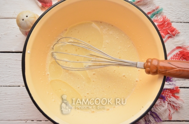 Размешивая будущее блинное тесто венчиком, начните подсыпать небольшими порциями пшеничную муку.