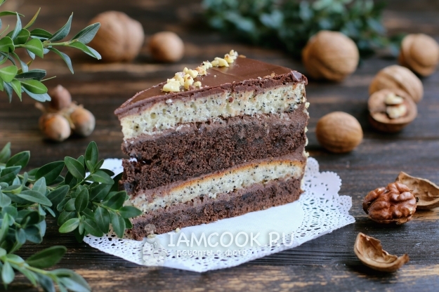 Оказывается, в советское время был и торт вот с таким представительным названием как «Министерский». В этом торте всегда присутствуют такие добавки как мак и орехи, но в каких-то рецептах они используются в составе коржей, а в каких-то орехи идут как посыпка поверх крема между коржами. В моем старом семейном рецепте именно так. Поэтому именно такой торт я и пекла. В нем коржи - с маком и шоколадные, крем шоколадный заварной со сливочным маслом и очень много орехов.