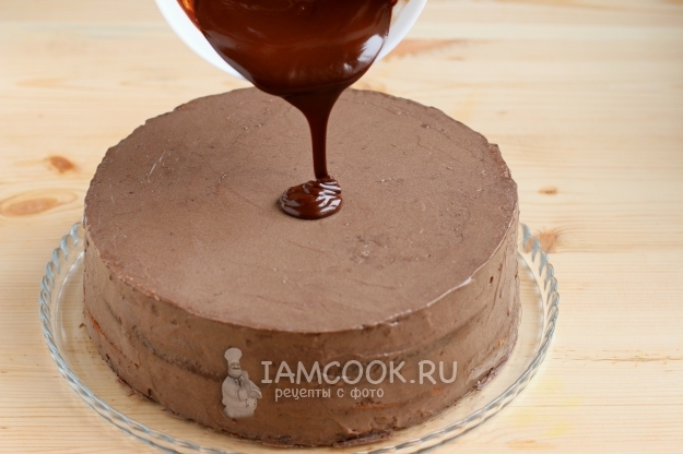 Часа через два достаем торт и покрываем его шоколадной глазурью. Чтобы сделать глазурь, растопим шоколад со сливочным маслом. Растапливаем шоколад короткими импульсами в микроволновке, чтобы не перегреть, периодически вынимая и перемешивая. Я покрывала торт глазурью лишь сверху, а для обработки боков измельчила блендером орешки в крошку.