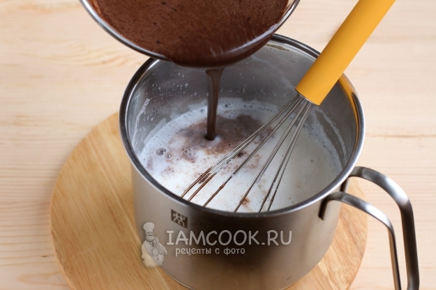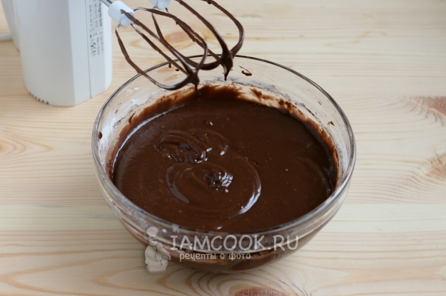 Смешиваем яйца, оставшийся сахар, муку и какао до однородной густой массы.