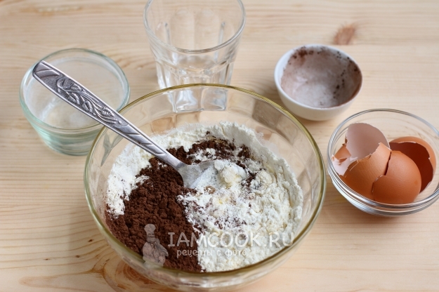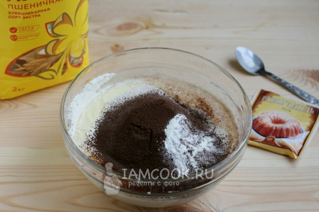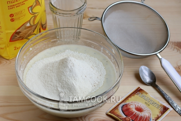 Просеиваем в миску муку с разрыхлителем, после чего аккуратно взбиваем на маленькой скорости до гладкого однородного состояния.