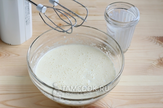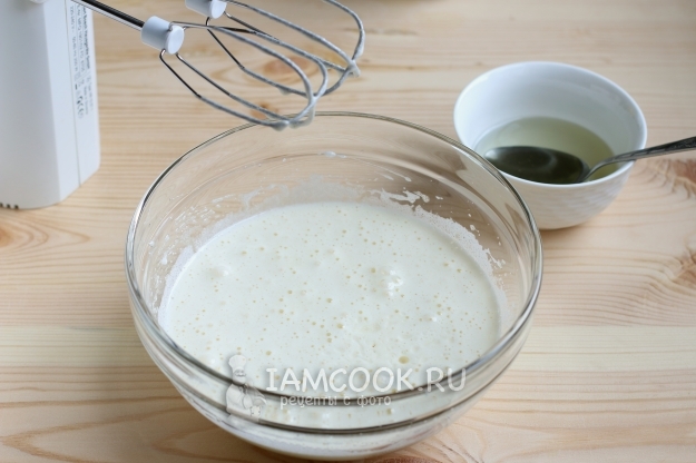 Вливаем в массу стакан кефира и снова взбиваем немного до объединения.