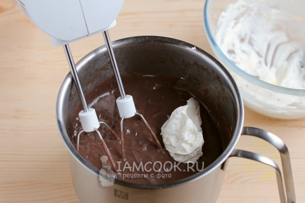 По одной ложке добавляем масло в остывший, но не холодный крем и взбиваем до однородности.