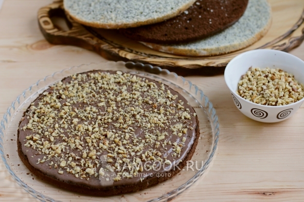Собираем торт, для чего разрежем вдоль коржи, чтобы у нас получилось по два маковых и шоколадных коржа. Шоколадный корж укладываем на блюдо и смазываем кремом. Сверху посыпаем измельченными орешками. Далее укладываем маковый, на него - крем, после опять шоколадный, сверху - крем и орешки. Получается, что орехами мы посыпаем крем на шоколадных коржах, а также оставляем для обработки боков торта. Последним будет маковый корж. Смажем верх и бока кремом и поставим торт в холодильник, чтобы крем стабилизировался.
