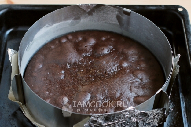 Достаем готовый корж, дадим ему остыть, вынимаем из формы и оборачиваем пищевой пленкой. До использования коржи держим в холодильнике.