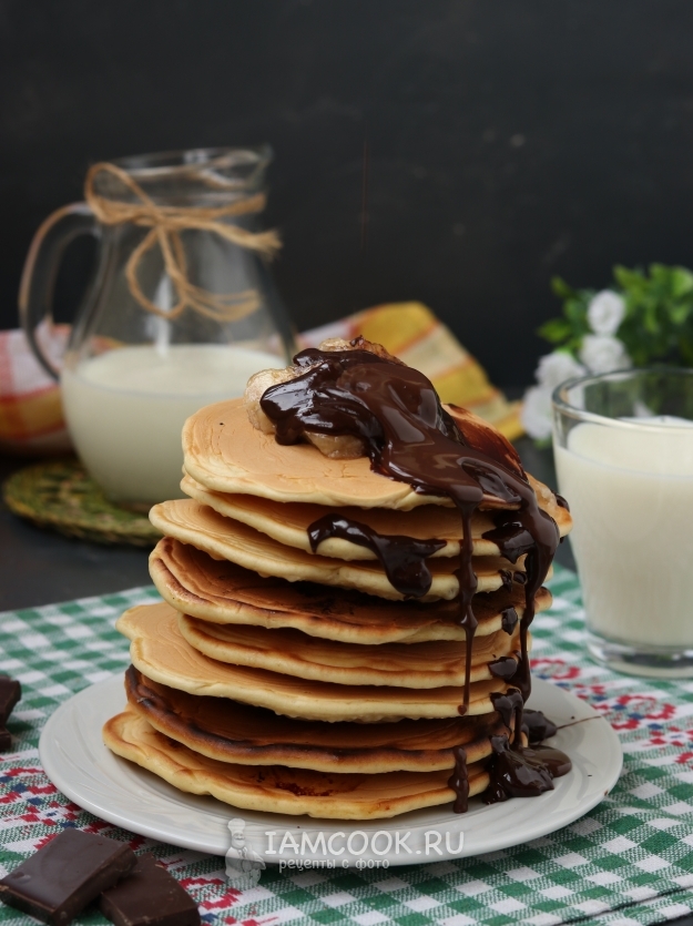 Кусочки бананов, которые остались, выложить сверху, растопить шоколад и полить им панкейки сверху.