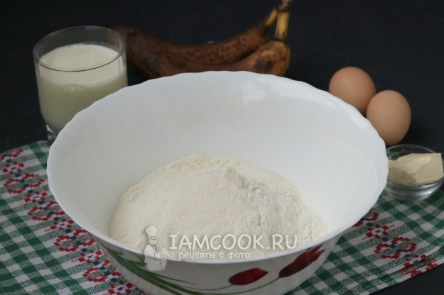 В миску просеять муку с разрыхлителем, добавить сахар, ванилин и соль.