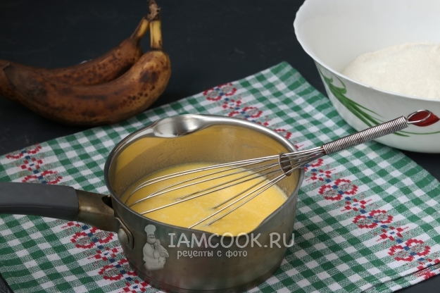 В эту смесь добавить яйца и хорошо взболтать венчиком. По рецепту нужно яйца взболтать с молоком, а затем добавить растопленное масло, но мне очень не хотелось пачкать лишнюю посуду.