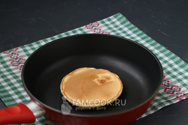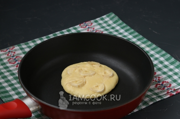 Хорошо нагреть сковороду, вылить в центр 2 ст.ложки теста и сразу разложить на поверхности кусочки бананов. Когда верх затянется и на нём не останется влажных участков, можно переворачивать.