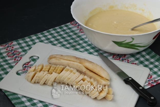 Банан разрезать вдоль на 2 части, а затем порезать на ломтики около 4 мм толщиной.
