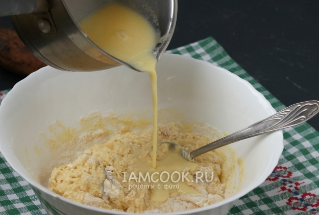Жидкую смесь понемногу вливать к сухим ингредиентам и перемешивать.