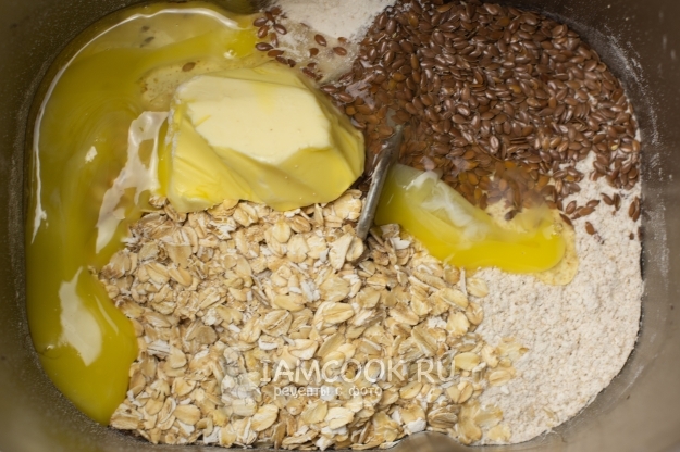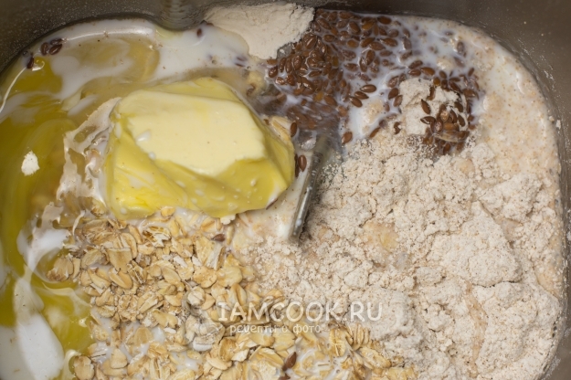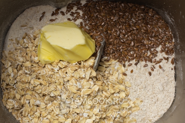Сухие ингредиенты добавлены. Осталось немного. Сверху положите масло.