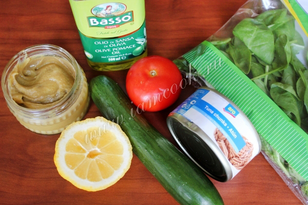 Подготовьте свежий шпинат, баночку тунца, огурец, помидоры, дижонскую горчицу покупную или домашнюю (см. рецепт), кусок лимона и оливковое масло.