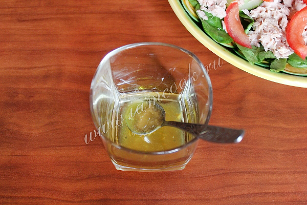 Для заправки соедините оливковое масло, дижонскую горчицу и лимонный сок, перемешайте, немного взбейте.