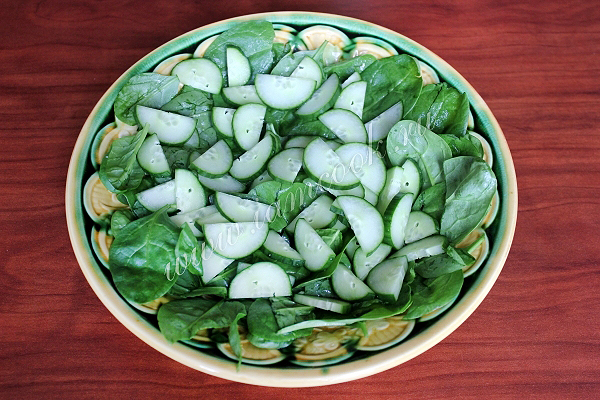 Листья шпината вымойте, обсушите и уложите на блюдо, сверху - дольки огурца и посолите.