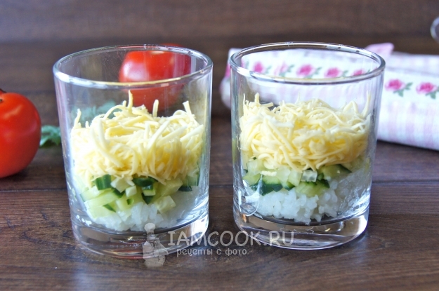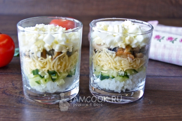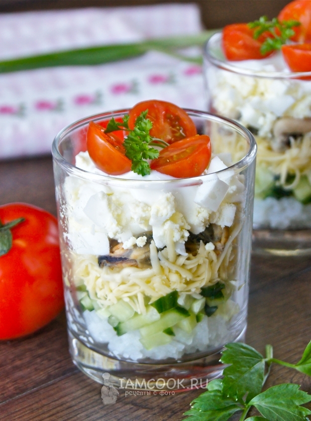 Совет! Такой слоеный салат в стакане хранится в холодильнике не более 12 часов.