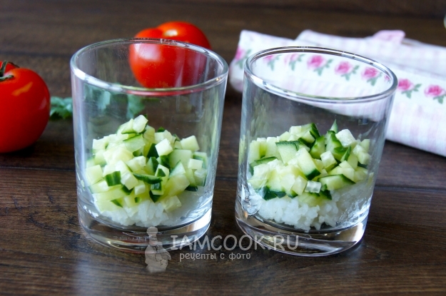 Огурец вымыла и нарезала на маленькие кусочки, выложила вторым слоем.