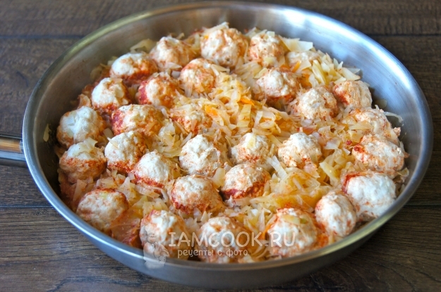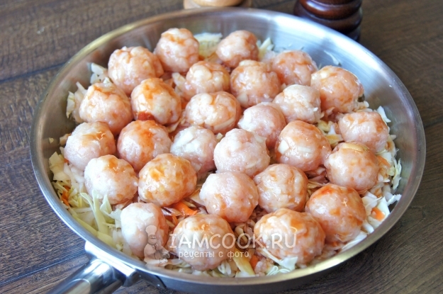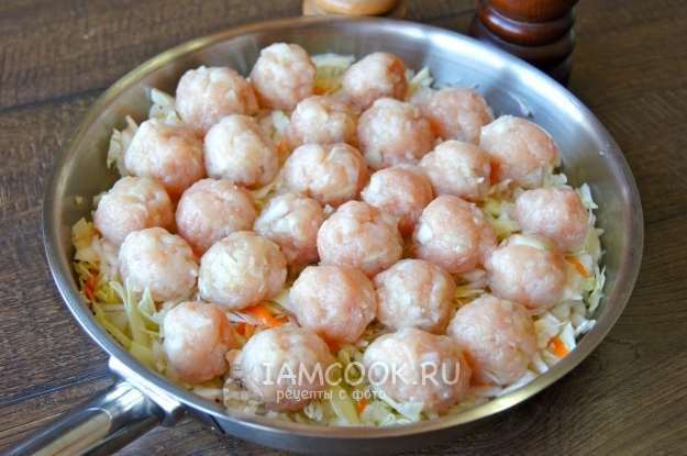 Из фарша сформировала фрикадельки размером с грецкий орех и выложила на капусту.